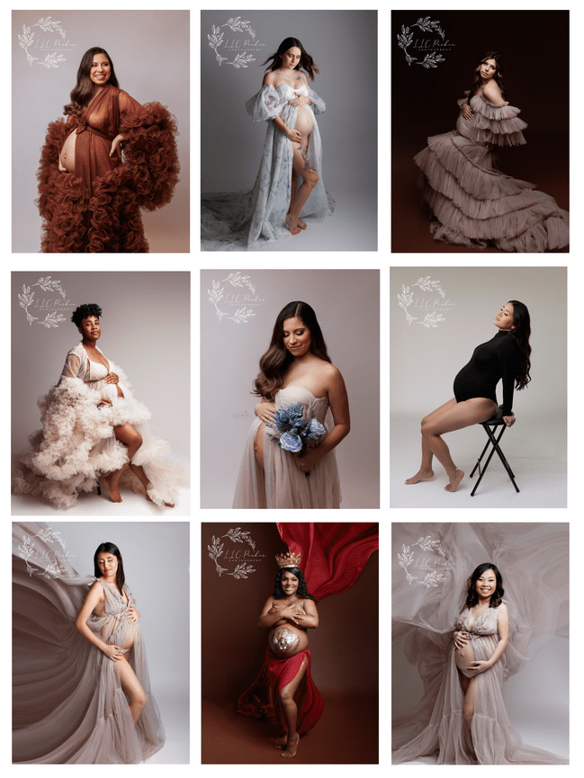 Maternity- $175 2hr shooting time, dress fitting, refreshments, unlimited use of the designer gowns in the client closet and a complimentary studio gift to be used during your session. Includes both indoor studio and outdoor options.